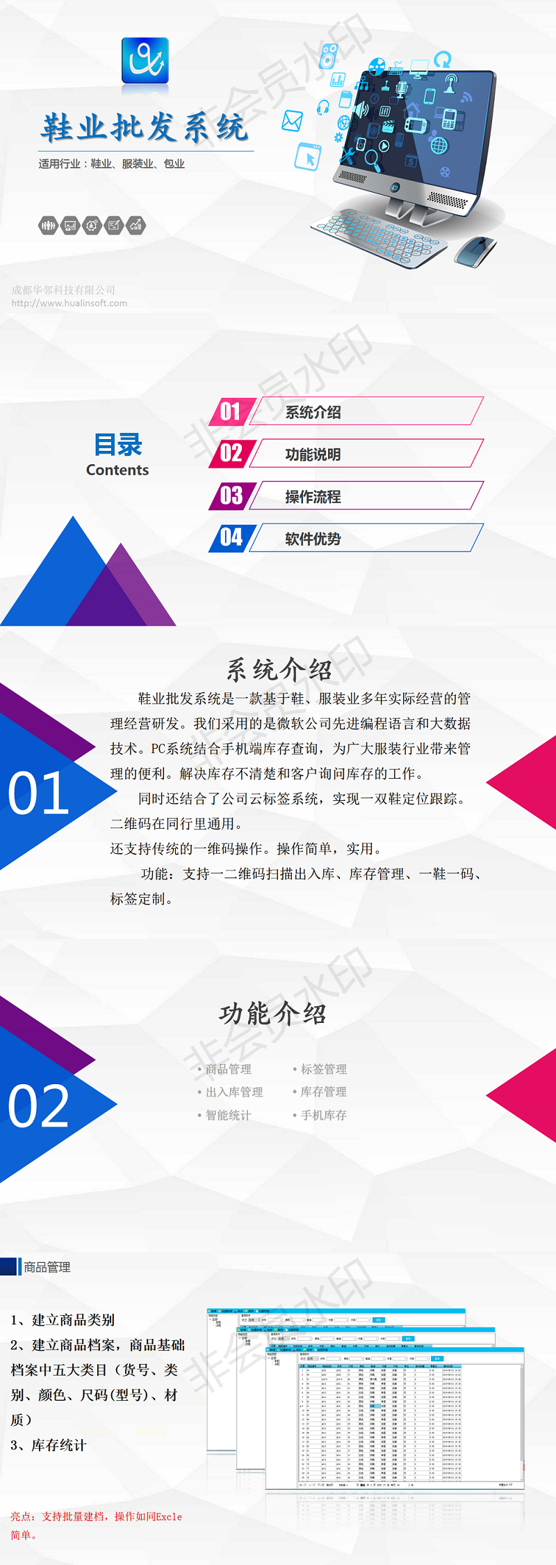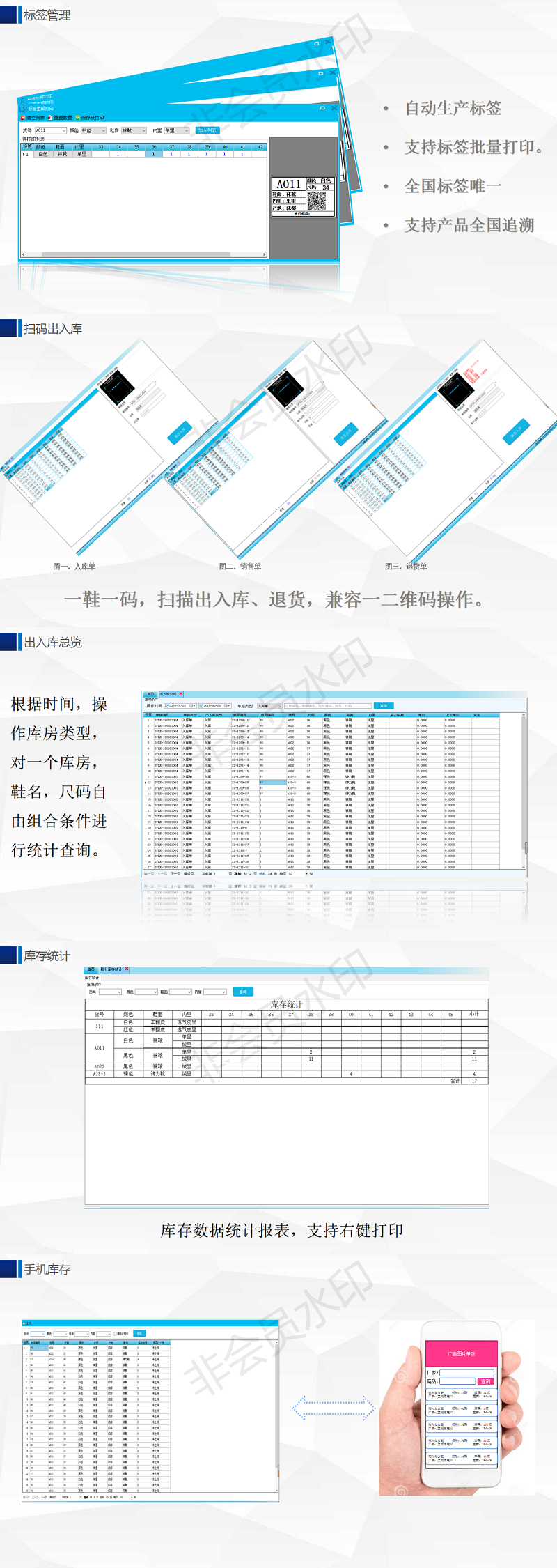 功能:支持一二维码扫描出入库、库存管理、一鞋一码、标签定制。