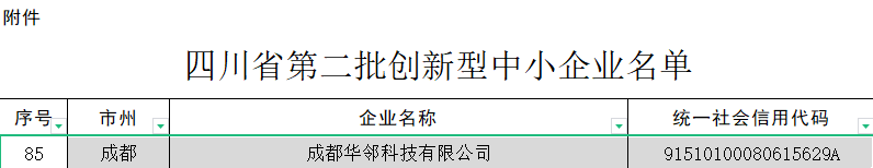 近日,成都华邻科技有限公司喜获殊荣,成功入选“四川省第二批创新型中小企业”。这是对公司在技术研发、产品创新等方面成绩的高度认可和肯定。
